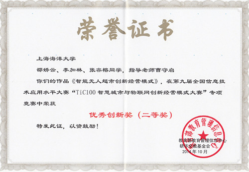 2014年6月至10月,第九届全国信息技术应用水平大赛“TiC100智慧城市与物联网创新经营模式大赛”专项竞赛在北京、上海、西安同时召开。我校英国威廉希尔公司官网研究生邵娇云、李加林和爱恩学院本科学生张容榕组队选送的项目《智能无人超市创新经营模式》经过层层选拔,最终在比赛中荣获全国二等奖,这是我校师生首次参与该比赛并获得奖项。