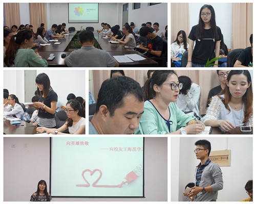 邹明明老师为大家讲述了“烈火金刚王海滨” 的事件过程,介绍了学院关于向见义勇为校友王海滨学习的主题活动开展情况。之后通过新闻报道专题视频回顾了本次事件,全面介绍了王海滨校友学习、生活、救人的诸多细节:一个刚毕业三年的大学生不顾自己生命安危,冒着大火从五楼到一楼将户居民一一叫醒,而自己因救人全身烧伤面积高达88%,至今仍然没有脱离危险,让师生们痛心不已。