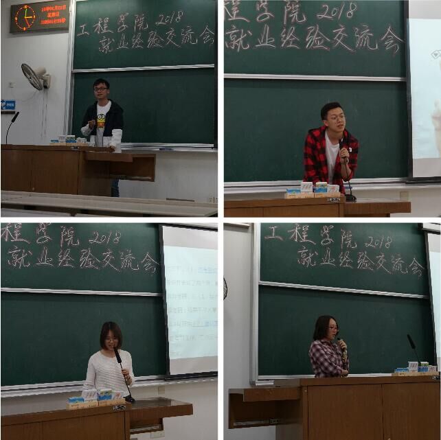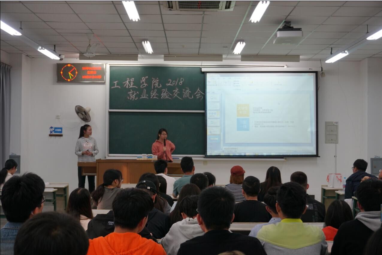 会上,四位毕业生先后分享了他们在实习、求职、就业过程中的经验及心得体会。就职于达科电子有限公司的张晟主要介绍了入职需要掌握的基本实用技能及工作过程中需注意的相关事项;就职于伟巴斯特车顶供暖系统有限公司的董仁明主要分析了本科生直接就业的优势及实习阶段应如何把握学习机会;就职于上海三菱电机·上菱空调机电气有限公司的陶洁结合自身经历,讲解了做好自我工作规划的重要性;就职于上海市农业机械鉴定推广站的沈天宜分享了她自身的求职经历,并介绍了很多考取专业证书的方法及途径。