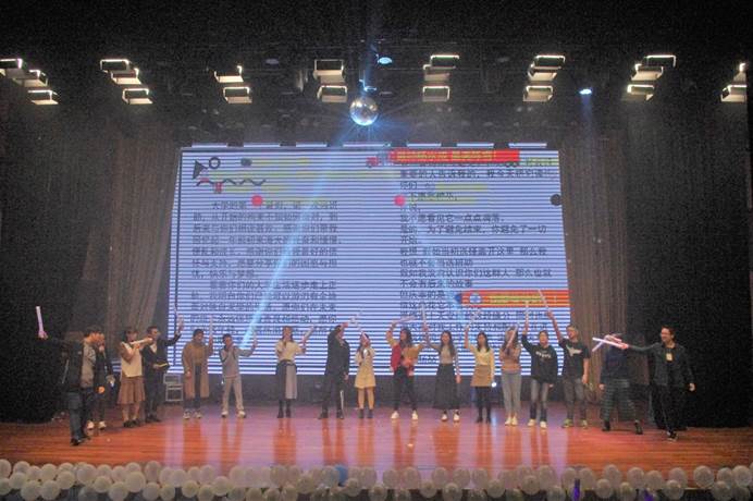 年轻的我们青春飞扬,志在四方,回首往昔,朋辈引领一直是我们前行的力量。在观众们的欢呼声中2018级的班助也纷纷上台表演,并送上了对新生们的祝福,2018级新生则心怀感恩之情为班助送上了鲜花与呐喊。