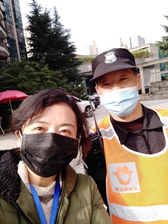 图片4. 杨琛老师天天巡岗,和各个小区门卫师傅都熟悉起来,合影留念