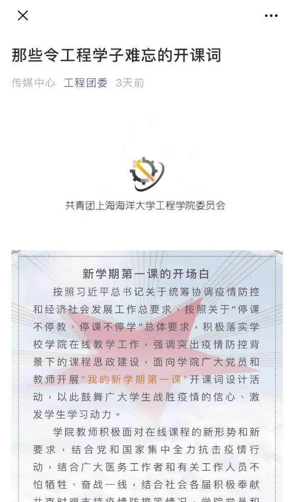 按照关于“停课不停教、停课不停学”总体要求,学院教师积极面对在线课程的新形势和新要求,结合党和国家集中全力抗击疫情行动,结合广大医务工作者和有关工作人员不怕牺牲、奋战一线,结合社会各届积极奉献共克时艰支持疫情防控等情况,学院党员和教师针对课程和学生具体实际,设计了“我的新学期第一课”开课词。