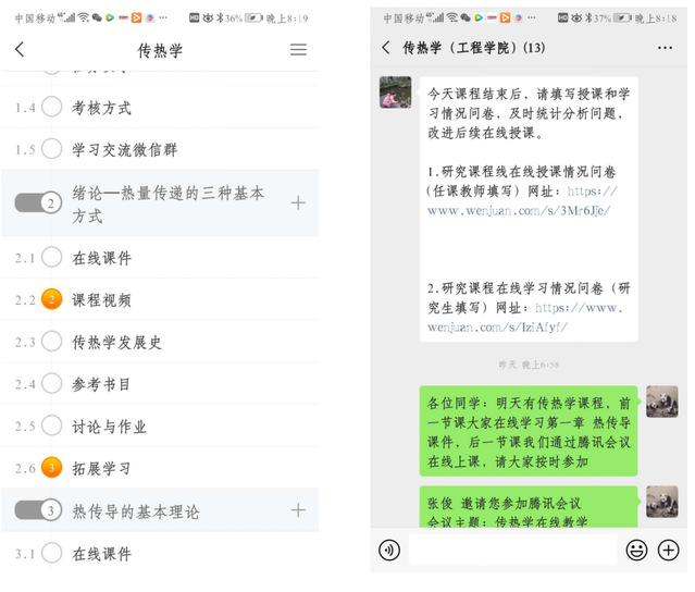 张俊老师是研究生《传热学》课程的授课老师,最近他总结了在线教学的经验,和老师们一起交流分享。为了上好每一堂课,他想了很多办法,在线教学授课中,综合利用了超星学习通、泛雅平台、腾讯会议、腾讯课堂、微信群等网络平台进行在线教学和课堂互动,逐步形成了一种“线上课件+录制视频学习+腾讯会议线上讲解+线下作业”的授课方式。考虑到学生隔离在家,教材和相关学习资料不足,通过各种途径为学生准备电子教材、参考书、学习视频等大量学习资料。上课前,通过在微信布置课件和录制视频的学习内容、腾讯会议线上讲解的时间、会议ID号等!前一节课让学生在泛雅平台学习课件和录制视频,后一节课通过腾讯会议进行讲授重点、现场答疑、讨论等方式授课。