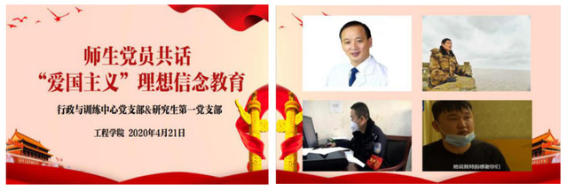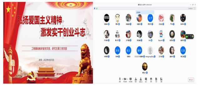 师生党员们集中学习了《教育系统关于学习宣传贯彻落实〈新时代爱国主义教育实施纲要〉的工作方案》、《关于深化新时代教育督导体制机制改革的意见》、《关于持续解决困扰基层的形式主义问题为决胜全面建成小康社会提供坚强作风保证的通知》等文件,以及习近平给北京大学援鄂医疗队全体“90后”党员的回信。在工程基础教研室党支部与研究生第三党支部联组学习中,工程基础教研室党支部书记张俊同志做了《弘扬爱国主义精神,激发实干创业斗志》主题党课,通过对爱国主义溯源、明理、晰义、践行几个方面,深入理解爱国主义精神,并结合当下抗疫背景、历史背景两方面展现了青年一代要有理想、有本领、有担当,要把爱国之情和报国之情相结合,传承民族精神和弘扬时代精神相结合,广大学生党员要厚植爱国主义情怀,在困难险阻面前,敢于担当,不怕牺牲。