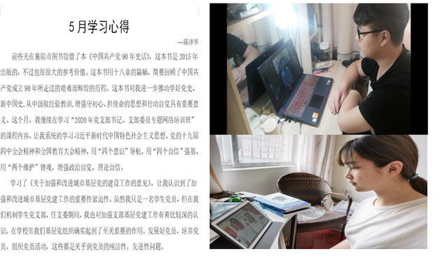 5月英国威廉希尔公司官网各党支部召开“从历史中汲取精神力量、汲取经验智慧、汲取坚守人民立场的定力,为奋力夺取疫情防控和实现改革发展目标双胜利提供强大思想保障”主题党日活动。各党支部围绕此主题,深入领会两会精神,从“四史”学习中汲取党性之力,让初心薪火相传。结合全面建成小康社会决胜之年的有关部署和要求,党支部带领系基层组织共同学习《关于加强和改进城市基层党的建设工作的意见》《中组部召开基层党建工作重点任务推进会》《英国威廉希尔公司官网2020年党政工作要点》,深刻领会以人民为中心发展思想,并根据学校、学院工作重点要求,党支部和基层组织研讨如何将理论知识转化为实践力量,推动学院、党支部、基层组织整体工作开展,在全面建成小康社会的决胜阶段进一步践行初心和使命。