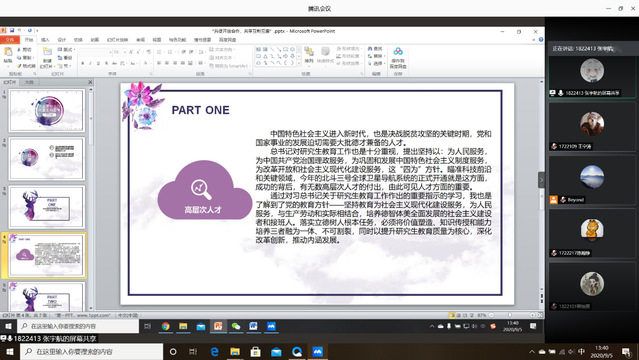 首先,支部书记毕杨意带领党员学习了习近平总书记在第二届进口博览会的讲话精神。我们要深刻学习党和国家在新时代背景下新的对外经济战略,坚持拼搏创新精神不能松懈。我们要充分发展开放型经济,与世界一道努力构建人类命运共同体。会上,支部党员从历史、未来发展、宝贵经验等方面通过文字或PPT的形式进行了发言,分别交流了自己的学习情况和所感所悟