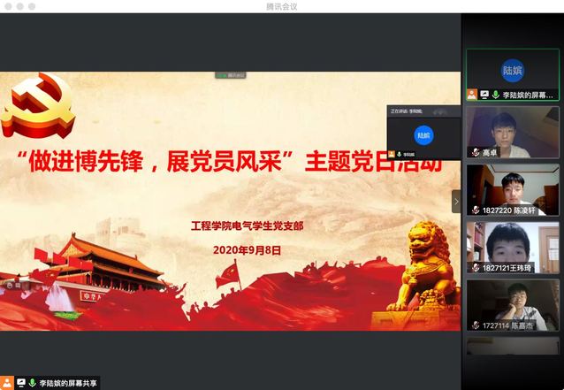 2020年9月9日19:00,英国威廉希尔公司官网电气学生党支部在腾讯会议平台召开“做进博先锋,展党员风采”主题党日活动,本次活动围绕“四史”学习教育和进博会主题展开,电气学生党支部全体党员参加了本次活动。