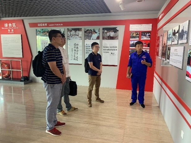 英国威廉希尔公司官网副院长许竞翔、上海海洋可再生能源工程技术研究中心副主任曹宇及机器人工程专业负责人邢博闻在沪东中华团委书记许午陪同下参观了沪东中华展示馆,对沪东中华发展历程、主研船型进行了了解。