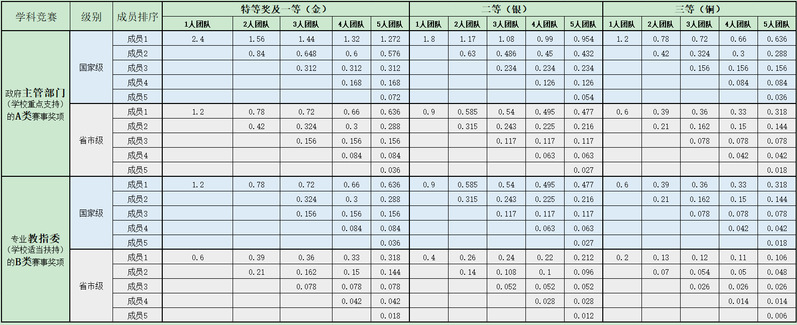 学科竞赛 | 级别 | 特等奖及 一等(金) | 二等(银) | 三等(铜) |