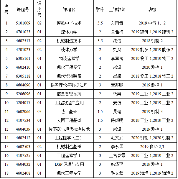 根据教务处﹝21秋﹞第(3)号2020-2021学年春季学期关于启动“好课堂”创建评选活动的通知,经个人申请、学院领导和督导评分、学院教学工作委员会评审,拟向教务处推荐以下18门课程创建“好课堂”,清单如下: