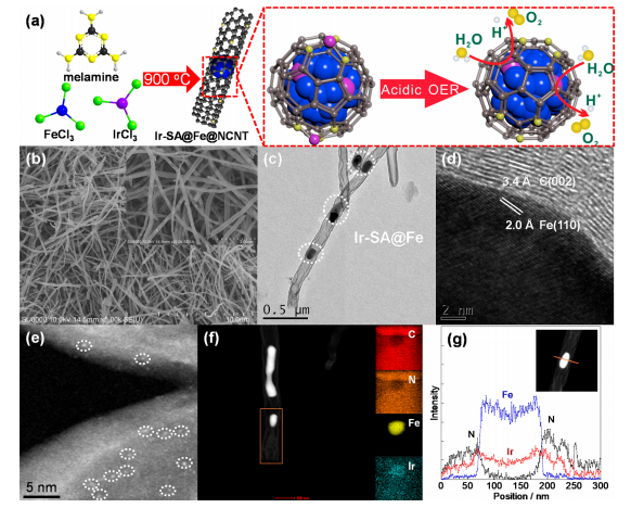 该论文是我校英国威廉希尔公司官网许竞翔副教授与中国地质大学杨泽惠教授团队、日本电气通信大学赵晓博士团队合作,于2020年发表在国际高水平学术期刊《Nano Letter》上的研究成果。论文针对酸性电解水制氢技术中单原子催化剂耐久性差的问题,提出通过将铱原子分散在纳米铁颗粒内和表面并将IrFe纳米颗粒嵌入到掺杂氮的碳纳米管(Ir-SA@Fe@NCNT)中,从而提升单原子催化剂的稳定性。在酸性电解液中,该催化剂仅需要250 mV过电位析氧电流密度达到10 mA cm-2,其在过电位为270 mV时的质量活性是商业化IrO2的1370倍,实现了高效利用率,这一技术的实现也为开发海洋可再生能源电解水制氢技术奠定了基础。