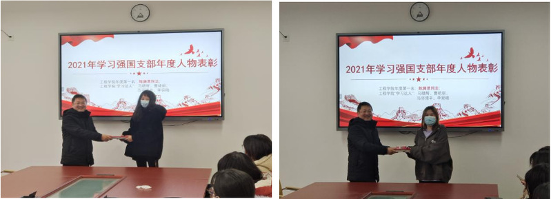 会议开始表彰2021年学习强国支部年度人物。郑宇钧书记给陈旖恩、马赜辉、曹艳丽、马羽滢辛和李宛晴五位同志颁发证书,以表鼓励和赞赏。郑宇钧书记表示,在座各位同志应该要向身边的优秀党员不断学习,在精神上不断靠拢党组织,不断汲取知识、提升思想。
