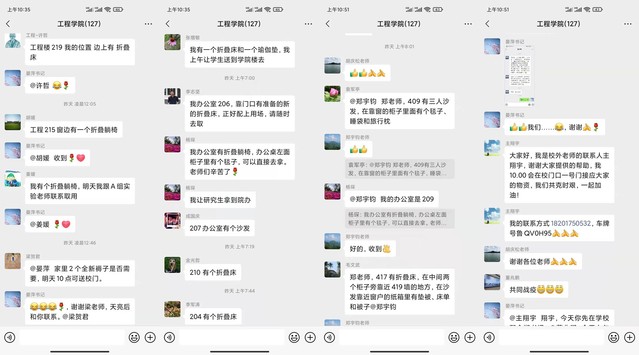 3月13日凌晨,英国威廉希尔公司官网微信群仍然不断有新消息出现,“我办公室靠门口有新准备的折叠床,请随时去取”“我办公室有折叠躺椅,可以直接去拿”“A组老师辛苦了,需要专车司机接送的联系我,我随叫随到”……为备战校园准封闭状态,确保师生顺利进行在线教学和期间校园生活,学院已有数十名教工主动请缨报名志愿服务,由于在此期间无法出校,得知消息的院内老师纷纷伸出援助之手,于是出现了上述的暖心一幕。疫情就是命令,防控就是责任。老师们的一腔热血,让工程人的防疫之路充满温情。这一刻,工程人用爱筑牢了防疫新阵线。