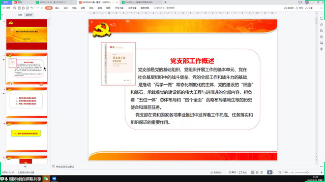 党支部是党的基础组织,是党的组织单元体,是党建设的组织血脉,在党和国家各项事业中发挥着工作托底、任务落实和组织保证的重要作用。周涛峰老师强调,我们预备党员作为党支部的重要组成部分,应当积极配合党支部进行支部内组织生活的标准化和规范化,实务技能的标准化和规范化以及其他一系列党务工作的标准化和规范化,这些任务不论是对加强党的组织体系建设,全面提升党支部的组织能力,还是强化党支部的各项政治功能,巩固党的长期执政组织基础,都具有十分重要的意义。