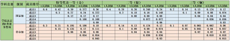 以团队获得奖励荣誉的,按照贡献度依次计算绩点,各成员绩点分配比例见附表3。