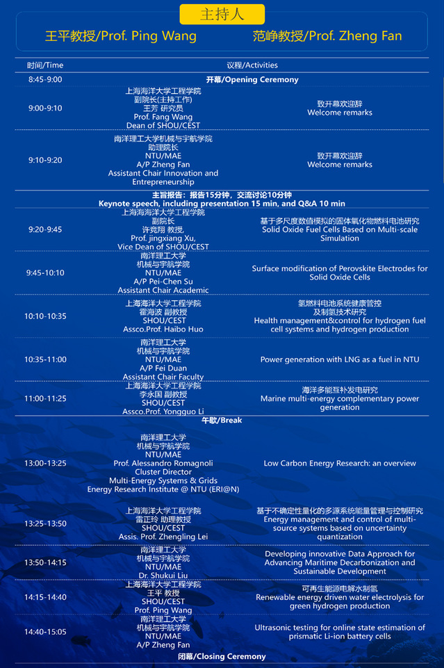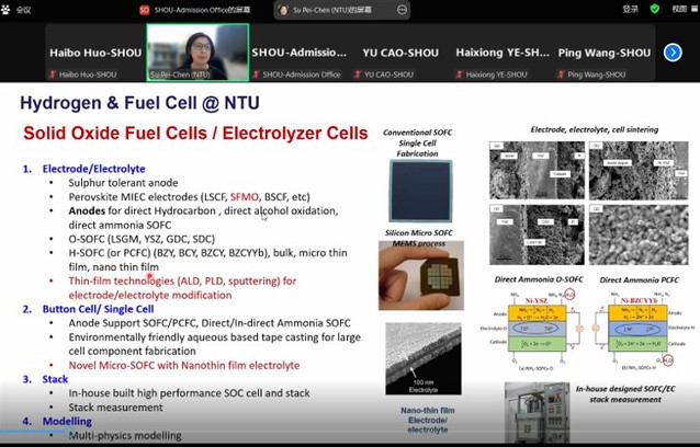 双方教师分别就固体氧化物燃料电池(SOFC)、固体氧化物电池(SOFC +SOEC)、氢燃料电池系统健康管控、LNG发电、海洋多能互补发电、低碳能源研究进展、多源系统能量管理与控制、海洋低碳与可持续发展的创新数据驱动方法、可再生能源电解水制氢、超声波技术用于锂电池在线状态估计的最新研究成果进行了展示,并进行了深入的沟通交流。
